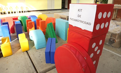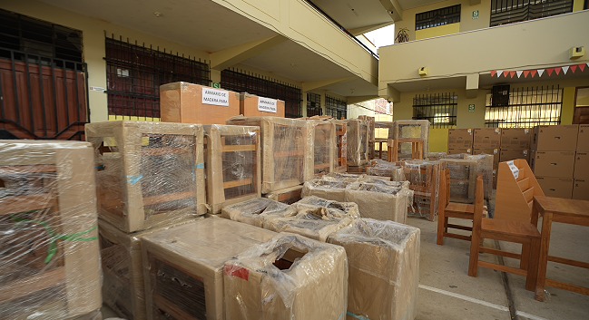 Los bienes mobiliarios consisten en carpetas, mesas y sillas para las instituciones educativas de inicial, primaria y secundaria. Además, entregó material educativo Montessori para los centros de Educación Básica Especial, módulos de Sector del Hogar para nivel Inicial, así como kits de material deportivo del área de Educación Física.