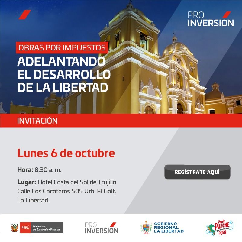 Trujillo será el escenario de “La Libertad Invierte 3.0”, un importante evento organizado por ProInversión bajo el lema “Adelantando el desarrollo de La Libertad”, que busca atraer inversiones privadas mediante el mecanismo de Obras por Impuestos (OxI). El Gobierno Regional de La Libertad, liderado por el representante del Gore, presentará una cartera de proyectos valorizada en más de S/ 1,290 millones, orientada a cerrar brechas sociales y dinamizar la economía regional.